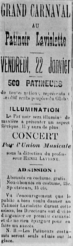 Dès février 1899, la Patinoir Laviolette devient le théâtre de carnavals et de mascarades. L’Union Musicale de Trois-Rivières y offre, durant la saison hivernale, des concerts et des séances de patinage accompagnées de sa fanfare.